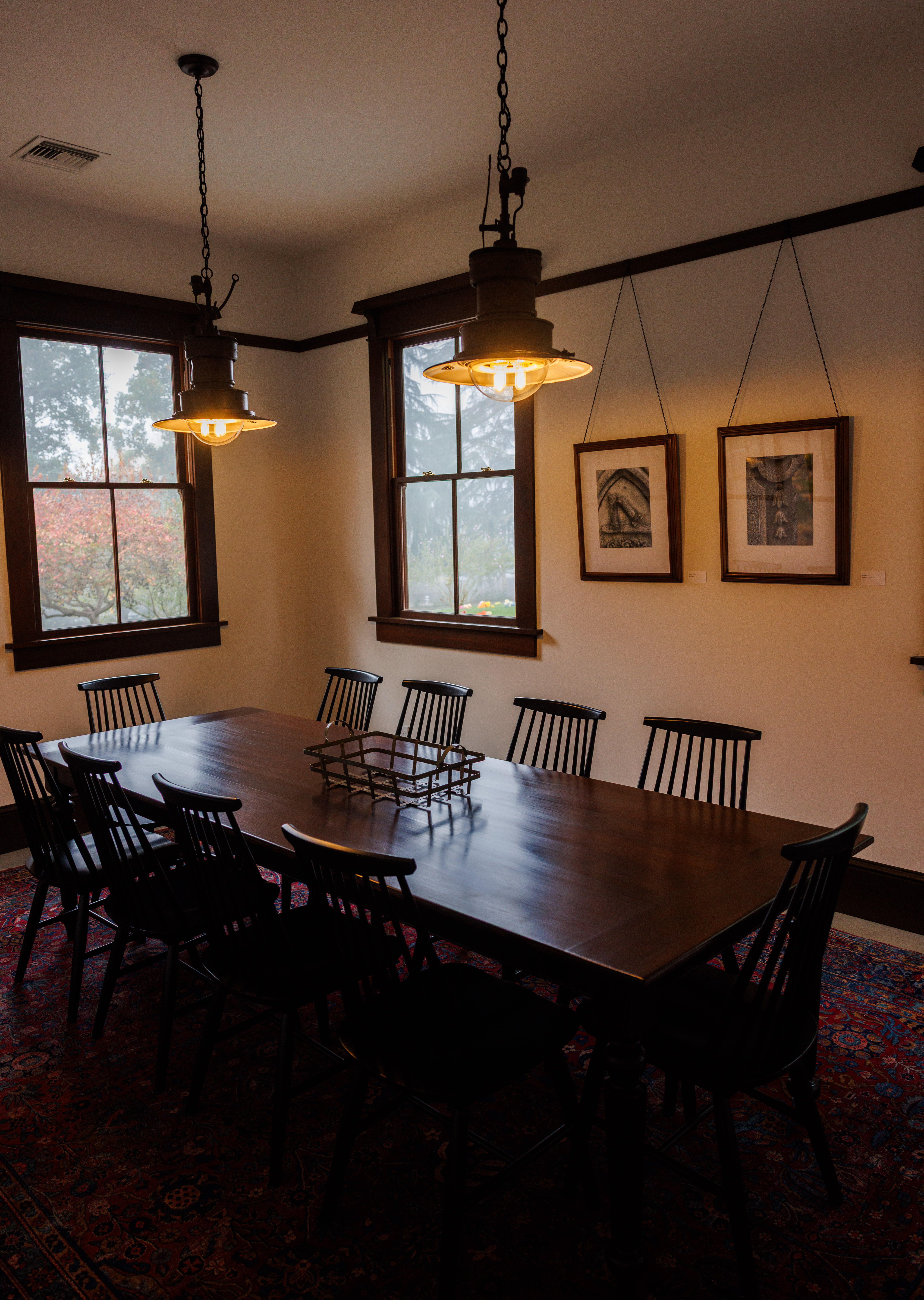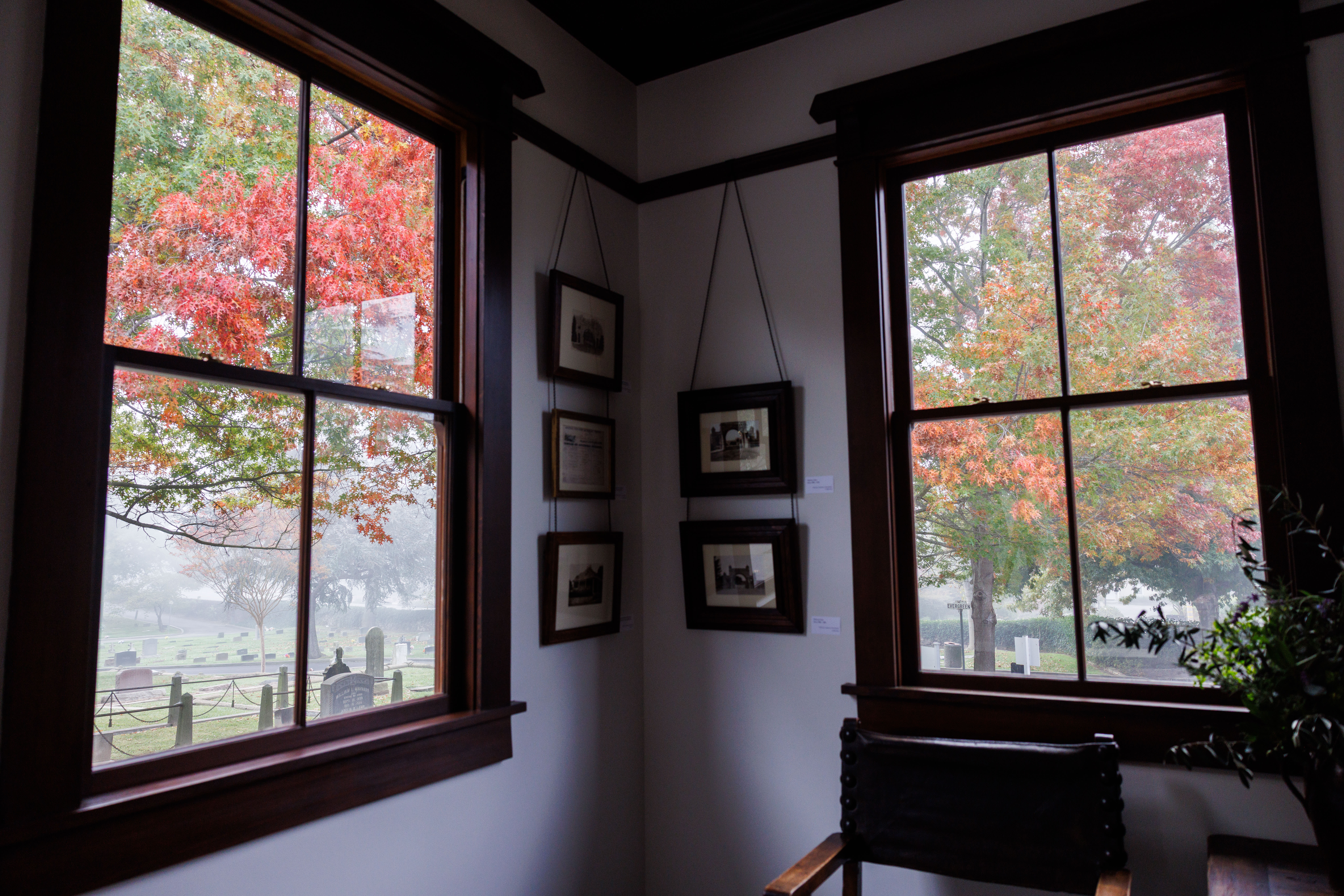 The interior spaces included in addition to the boardroom and bathroom are two offices, a galley-style kitchen and the museum room. All of those spaces are decorated with antique lighting fixtures as well as photographs relating to Tulocay Cemetery, from symbolic elements found through the cemetery to images of some family mausoleums.