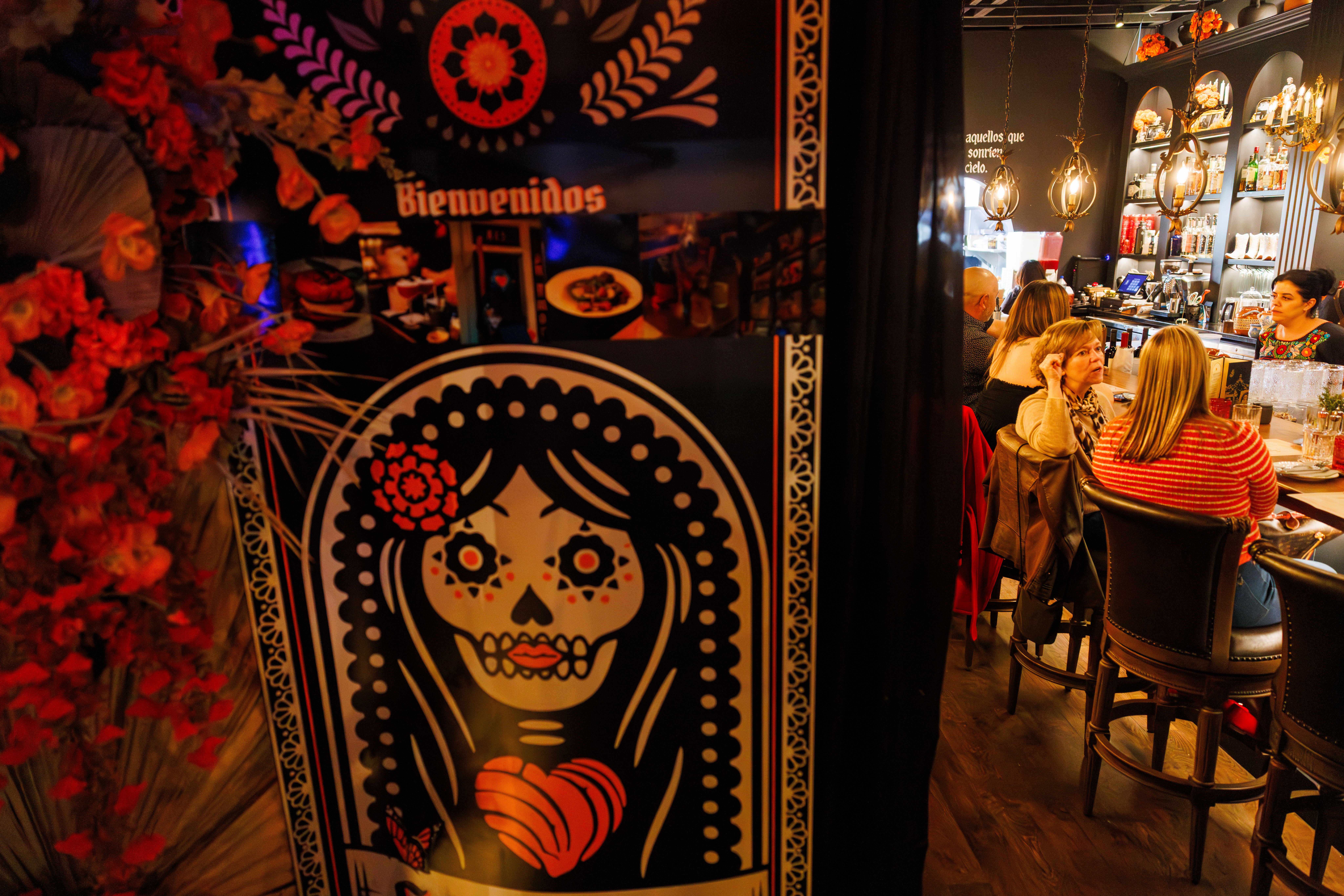 The space itself is small and cozy, set up to resemble a long table, inviting guests to chat with their neighbors should they wish to do so. Hand-painted murals by Arleene Correa Valencia, a local Latinx artist, make the space feel welcoming while clearly paying homage to Día de los Muertos themes of honoring the past with love and joy.