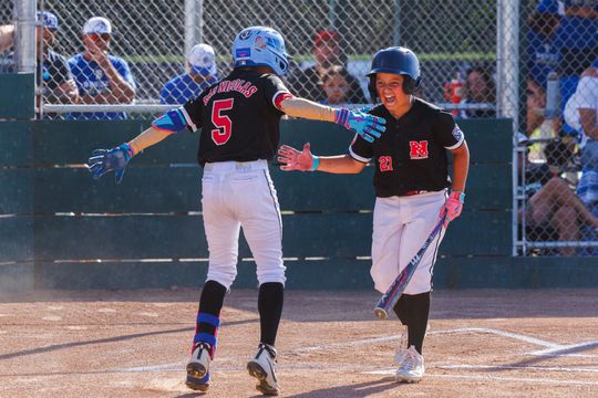 Napa American’s Vince Ruiz (27) and Cruz San Nicolas celebrate after scoring on a triple by San Nicolas, who came home on an errant throw, in the first inning of a Little League District 53 Major Division All-Star game against Benicia at Garfield Park on Tuesday, July 1.